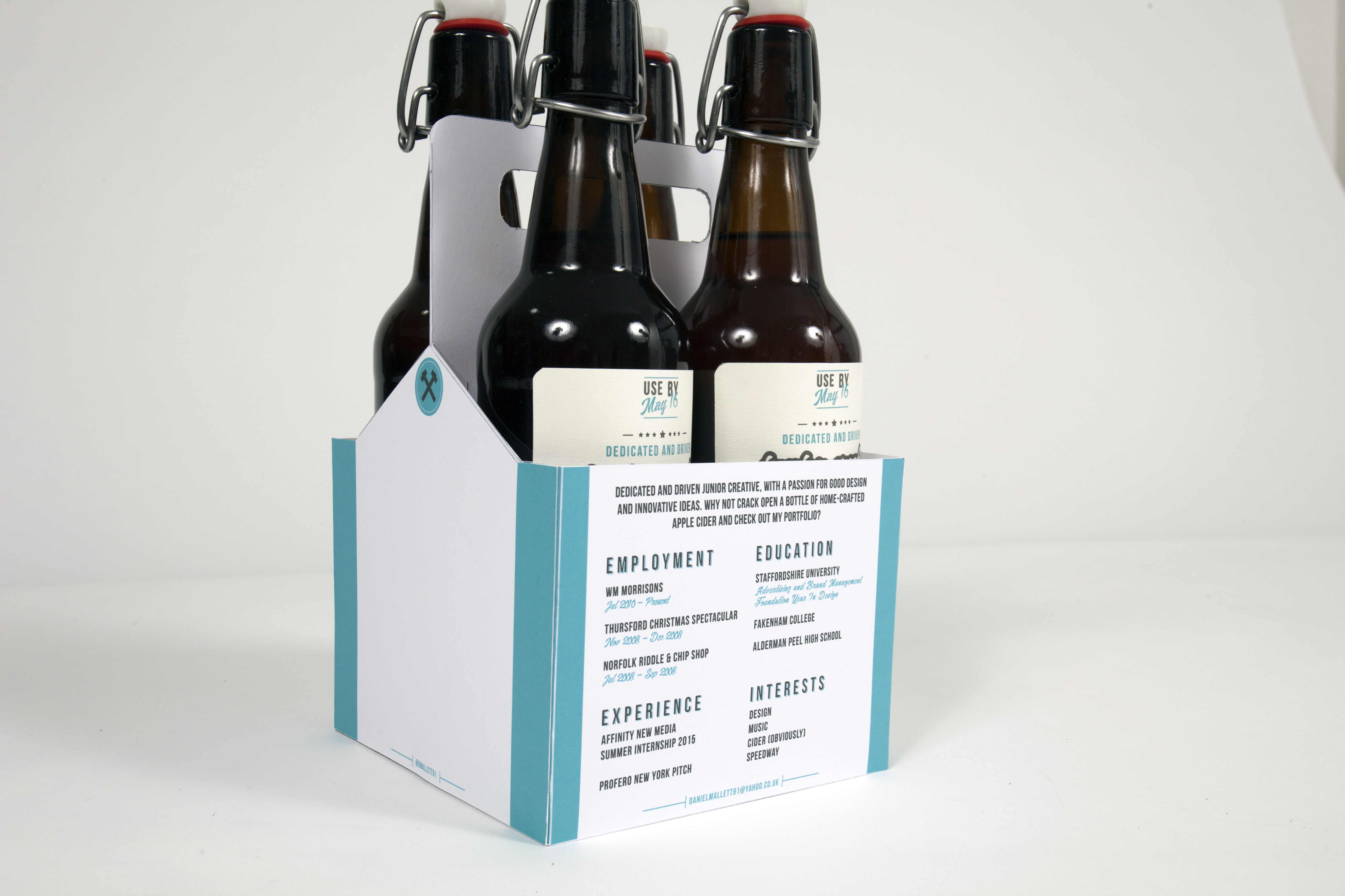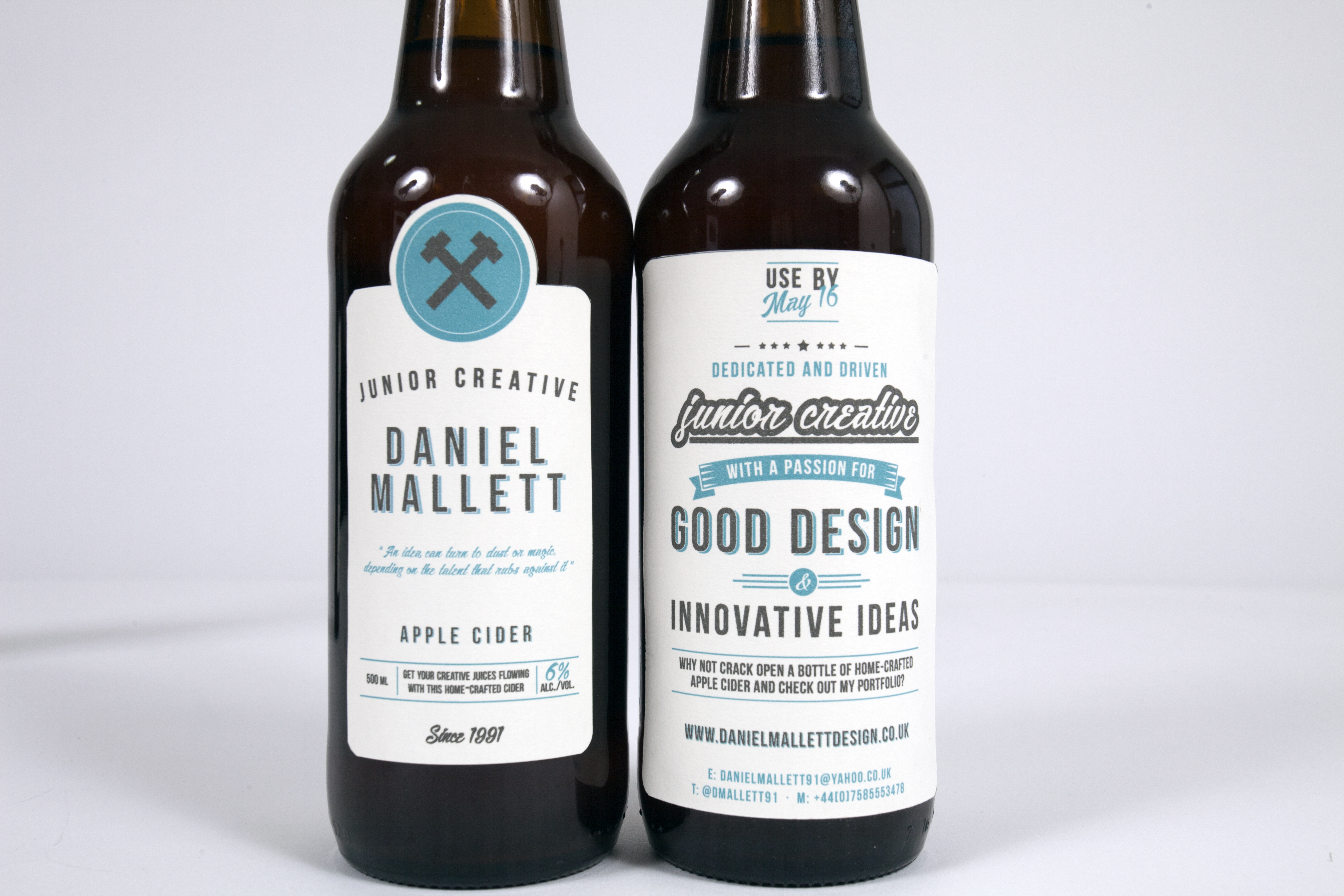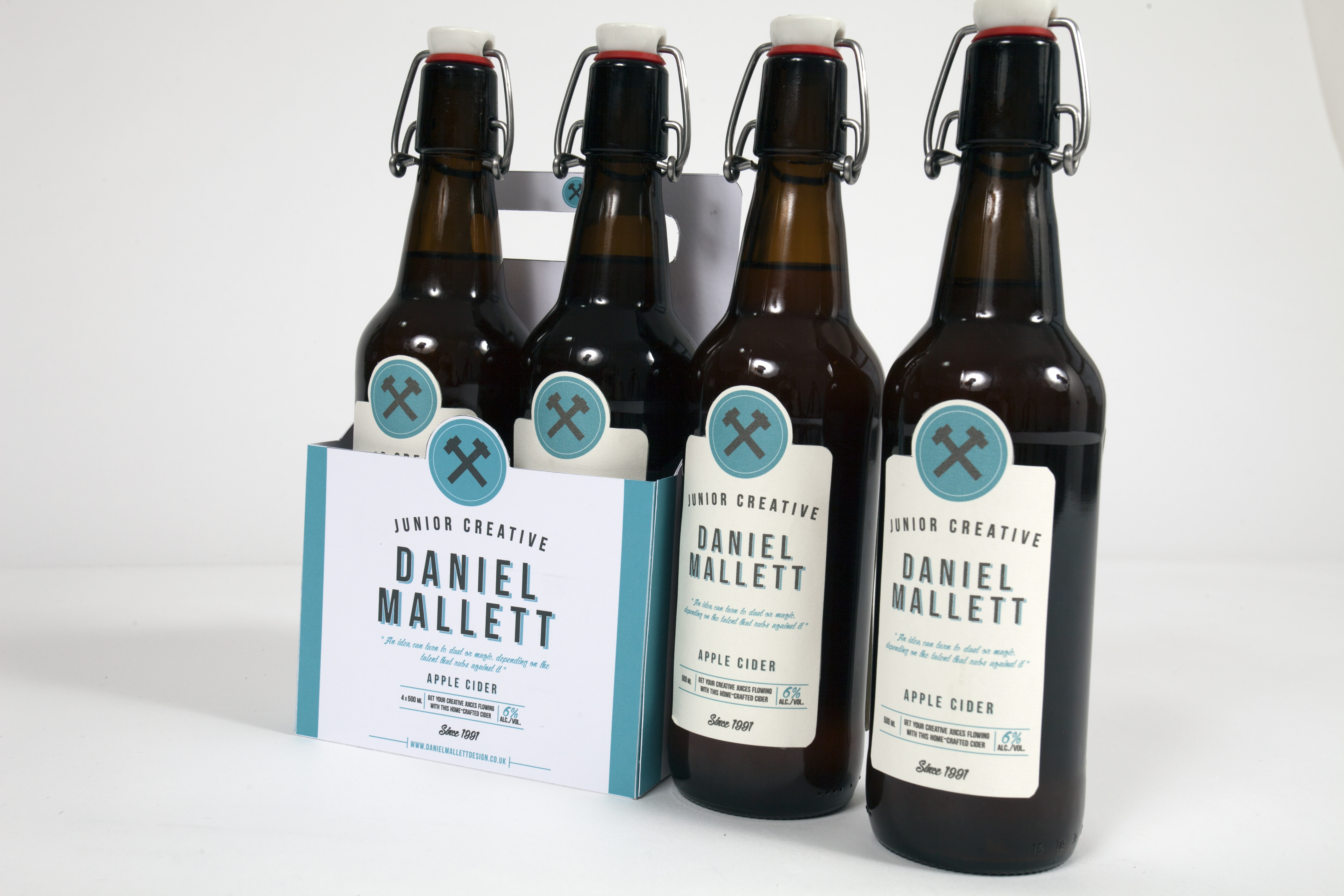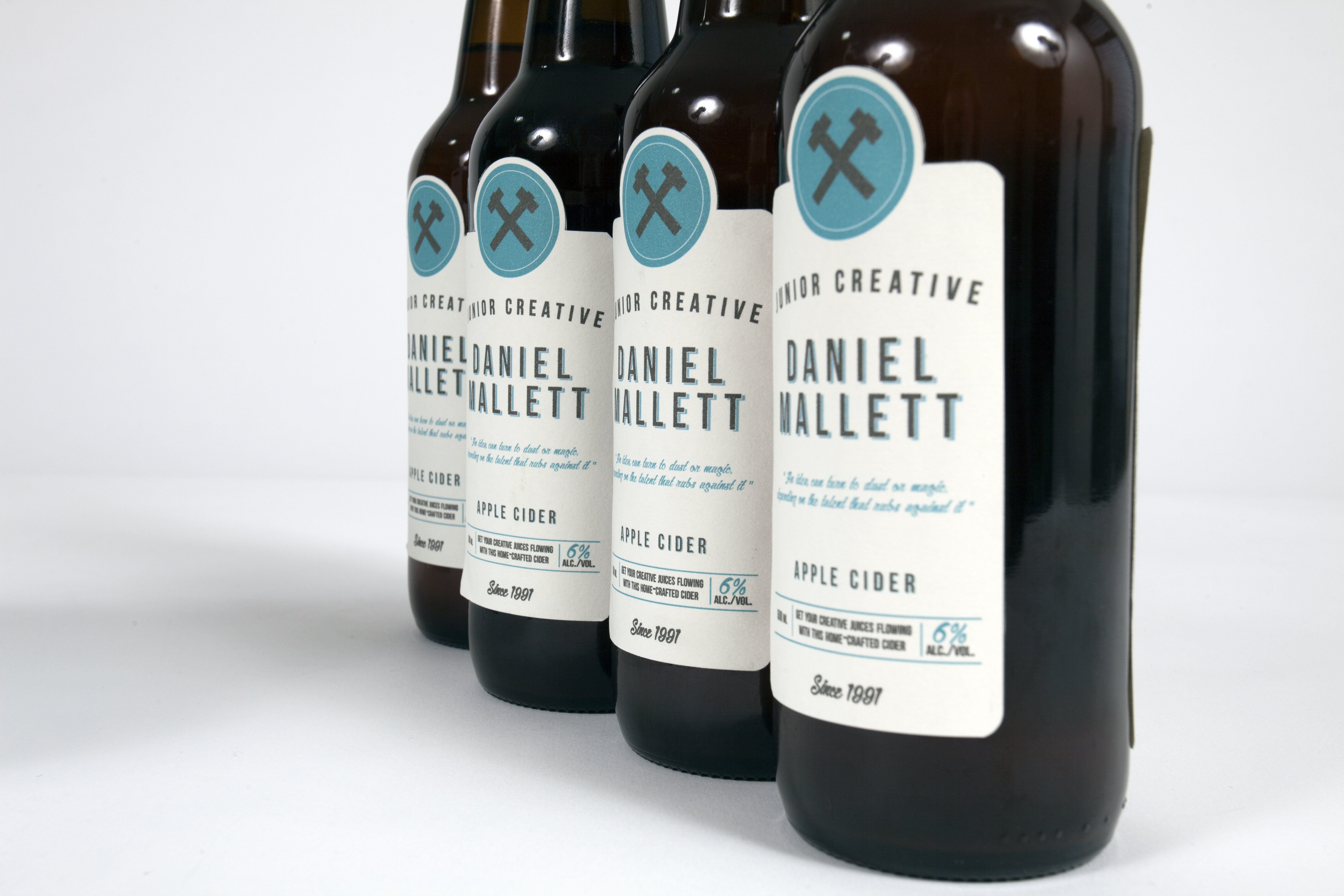 Insight – I looked at the drinking culture in advertising, as well as how my hometown of Norwich have recently been voted the real ale/cider capital of the UK, and decided to replicate this by home-brewing my own cider and using this to brand myself.